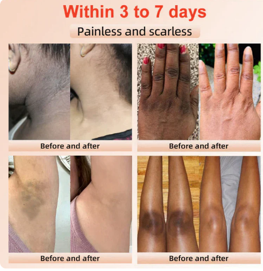 Transform your skin in just 3 to 7 days with our painless and scarless solution! This before and after showcase highlights the incredible results on various areas of the body. Whether it's stubborn scars, dark spots, or rough skin, our product delivers visible improvements with ease. Experience smooth, even-toned skin without the pain or scarring typically associated with other treatments. Say goodbye to imperfections and hello to flawless skin in just one week!